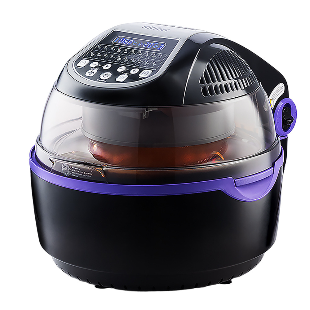 Современный классический аэрогриль Kitfort КТ-2219 позволяет готовить большинство продуктов без добавления масла. Например, картошку, мясо, рыбу, птицу, овощи, выпечку и многое другое. Вентилятор, расположенный в верхней части аэрогриля, обеспечивает циркуляцию горячего воздуха от нагревателя внутри рабочей емкости. Тем самым, продукты равномерно обжариваются со всех сторон, получаются нежными внутри и с хрустящей корочкой снаружи. Прибор оснащен электронным управлением и дисплеем для отображения температуры, времени и скорости вращения вентилятора. У прибора есть 20 автоматических программ. Вы можете начать приготовление в более позднее время, используя функцию отложенного старта. В комплекте к аэрогрилю идут вертел для приготовления курицы целиком, решетка, вращающаяся корзина. На решетке можно располагать продукты или термостойкие чаши и готовить в них. Вращающаяся корзина подходит для приготовления картошки-фри и других блюд. В центре ТЭНа находится галогеновая лампочка, которая подсвечивает продукты в чаше. Часть крышки сделана прозрачной, чтобы можно было наблюдать за процессом приготовления. Конструкцией аэрогриля предусмотрена удобная ручка и фиксатор крышки для предотвращения ее случайного открывания. Ручки корзины не нагреваются, и с их помощью можно легко вынимать корзину после завершения приготовления. Для удобного извлечения продуктов и горячих аксессуаров в комплектацию аэрогриля входят щипцы. Все аксессуары аэрогриля съемные и легко моются после использования.