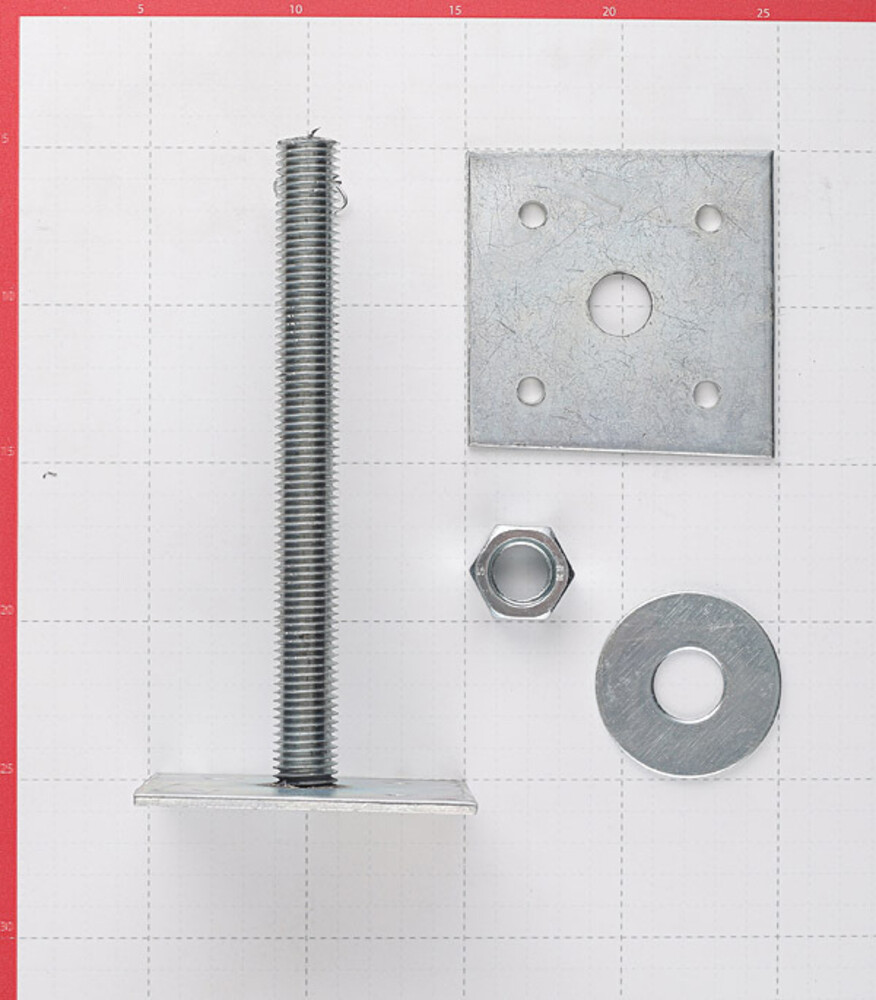 Состоит из двух оцинкованных стальных пластин, шпильки с метрической резьбой, шайбы и гайки.