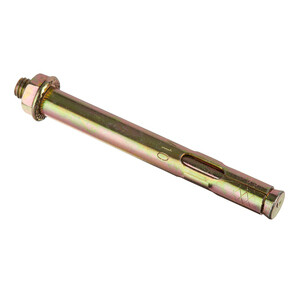 Оцинкованное покрытие обеспечит защиту от коррозии. Анкерный болт с гайкой (втулочный анкер) оснащен фиксирующей гильзой, длина которой равна размерам стального стержня. На хвостовой части шпильки выполнена клинообразная головка. При завинчивании гайки она смещается по резьбовой части. В результате перемещения происходит распирание втулки. Конструктивные особенности такого вида крепежа позволяют использовать его в легких видах бетонов с ячеистой структурой, а также в кирпиче, изготовленном из обожженной глины.