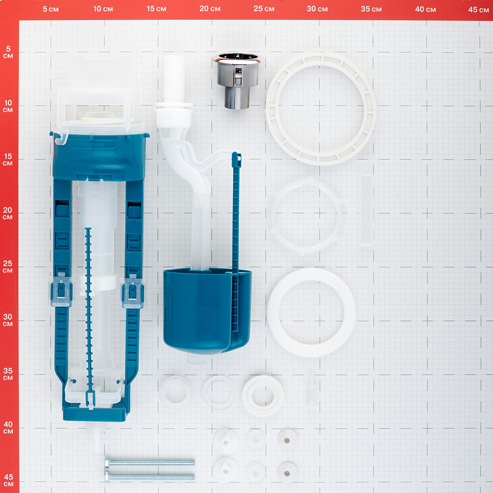 Преимущества: клапан очень компактен и удобен при монтаже, отличается пониженным уровнем шума. В комплекте прилагается крепление для бачка. Комплект арматуры изготовлен в соответствии с требованиями ГОСТ 21485-2016 («Бачки смывные и арматура к ним»). Хромированное покрытие кнопки сливного клапана. Прокладка Воротынская (ЗАО «Угра Керам» (п.Воротынск), прокладка является базовой универсальной прокладкой, подходящей для широкой линейки современных унитазов отечественного и импортного производства.