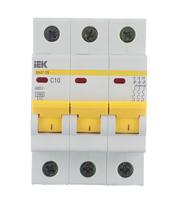 Расшифровка маркировки: 3Р — трехполюсной (используется в трехфазных сетях), 10А — величина номинального тока в амперах (ток, который автомат способен пропускать долгое время без отключения цепи), тип С — автомат срабатывает при токе в цепи в 5-10 раз больше номинального и применяется для защиты цепей розеток и освещения, 4.5кА — рабочая отключающая способность в килоамперах, ИЭК — фирма производитель, ВА 47-29 — серия автоматов.