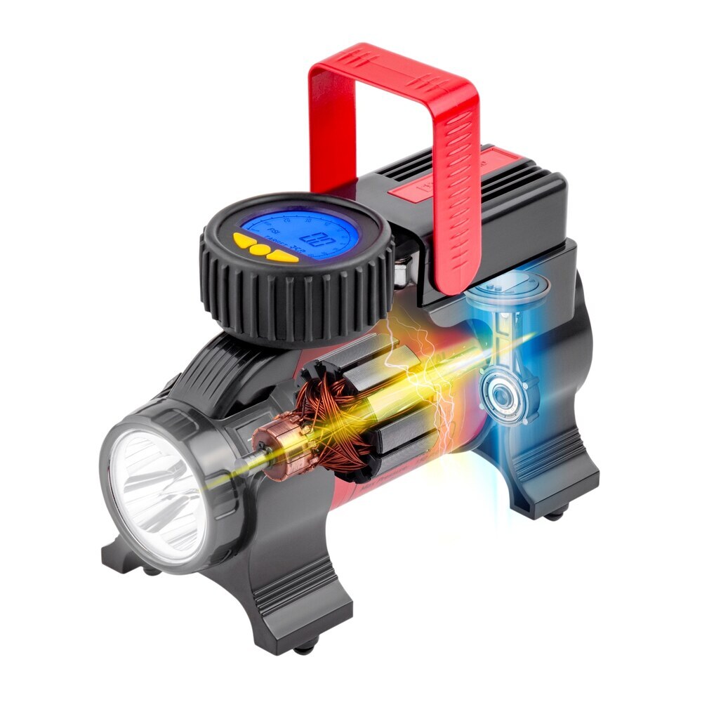 Цифровой компрессор с автостопом DSV, оснащенный: LED фонарем, набором переходных штуцеров, может использоваться для накачивания шин автомобилей и другого транспорта, различных надувных изделий, спортивного инвентаря. Производительность 35 л/мин обеспечивает комфортную скорость накачивания.