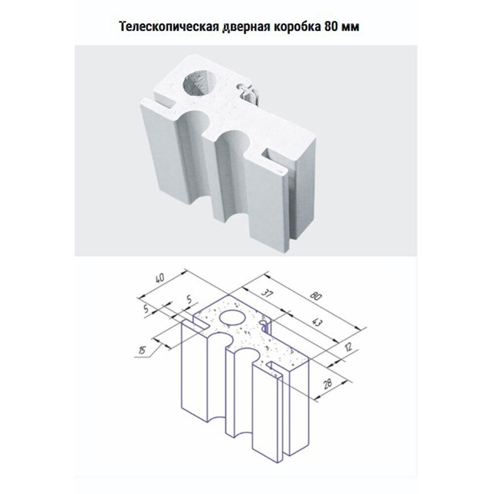 Дверное полотно глухое. Элементы несущего каркаса — влагостойкий LVL брус. Наполнитель — пенополистирол экструзионный. Кромочная ПВХ лента 1,5 мм. Облицовочный ПВХ лист 1,5 мм, окрашенный в массе. Вставка под механизм замка из ДПК бруса. Телескопическая дверная коробка из экструдированного ПВХ. Уплотнитель. Размер фрезеровки — 195х18х73 (ВхШхГ), межосевое расстояние — 85 мм.