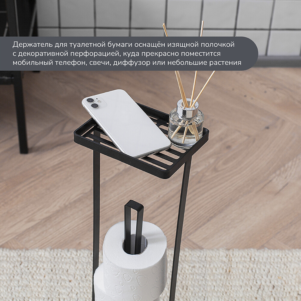 Держатель вмещает до трех рулонов туалетной бумаги, что позволяет не ходить за каждым рулончиком к ее месту хранения. Самое приятное – это небольшая полочка, на которой вы можете разместить свечи, диффузор с тростниковыми палочками, небольшое растение или мобильным телефон.