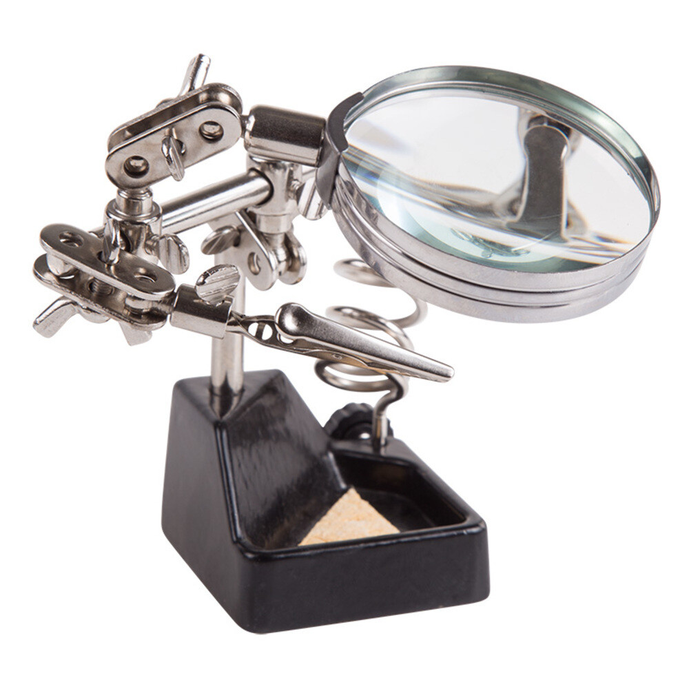 Держатель «третья рука» с лупой х2.5 служит главным образом при проведении паяльно-сборочных работ в электронике, ювелирном деле, сборке и ремонте для зажима мелких деталей в любом нужном положении, когда не хватает двух рук. Инструмент состоит из чугунного основания (тяжелая подставка с нишей для губки, мелких деталей или припоя), шарнирного соединения с зажимами типа «крокодил» (подвижных во всех плоскостях) с никелевым покрытием, лупы с 2.5-кратным увеличением (возможность регулировки положения, диаметр линзы 60 мм) и спиралевидной подставки под паяльник. С помощью лупы можно будет рассмотреть даже самые мелкие детали.