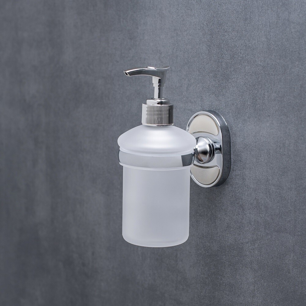 Дозатор подвесной с держателем предназначен для порционной подачи мыла, шампуней и других гелеобразных жидкостей. Изготовлен из матового стекла. Подача моющего средства осуществляется с помощью пластиковой помпы. Монтируется к стене при помощи крепления, входящего в комплект.