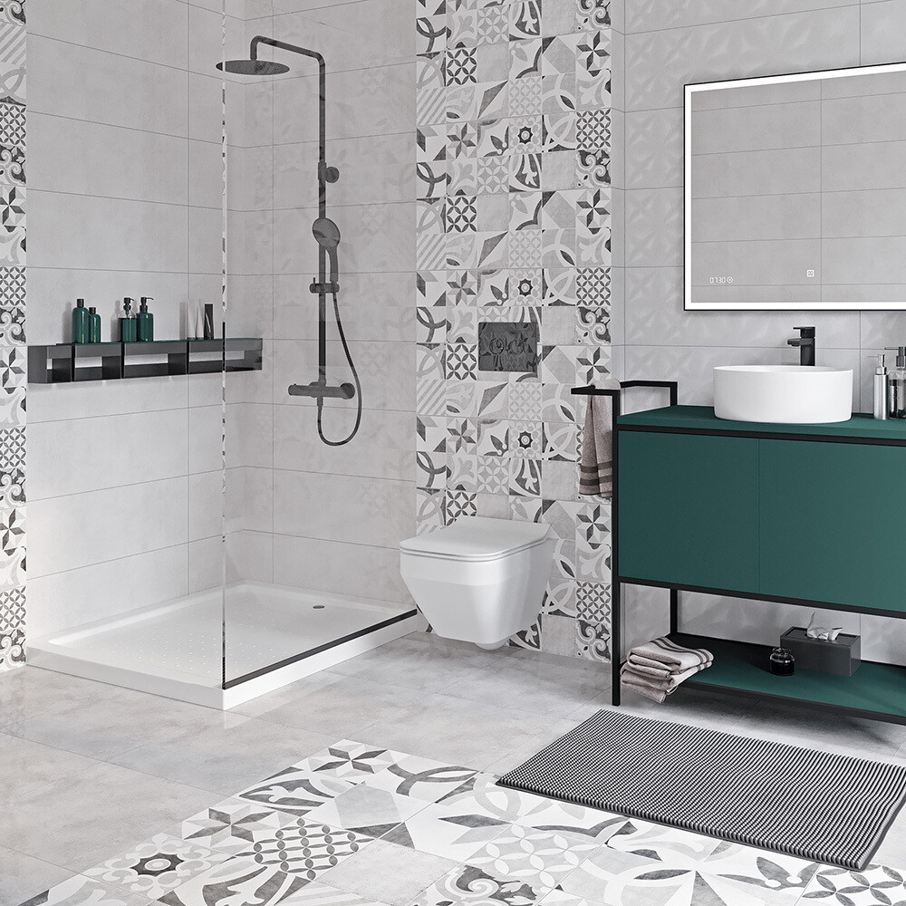душевой комплект (тропический душ, лейка, стойка, душевой шланг), смеситель, гарантийный талон, инструкция по эксплуатации.