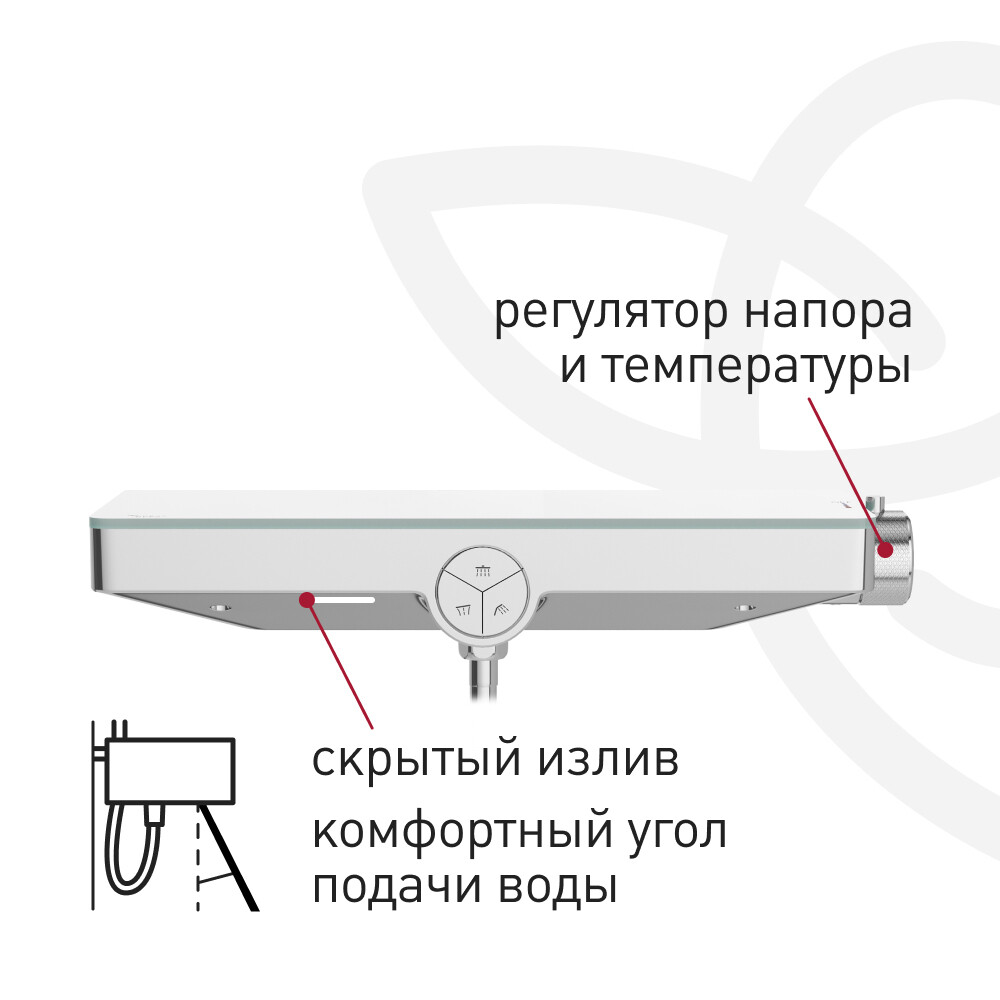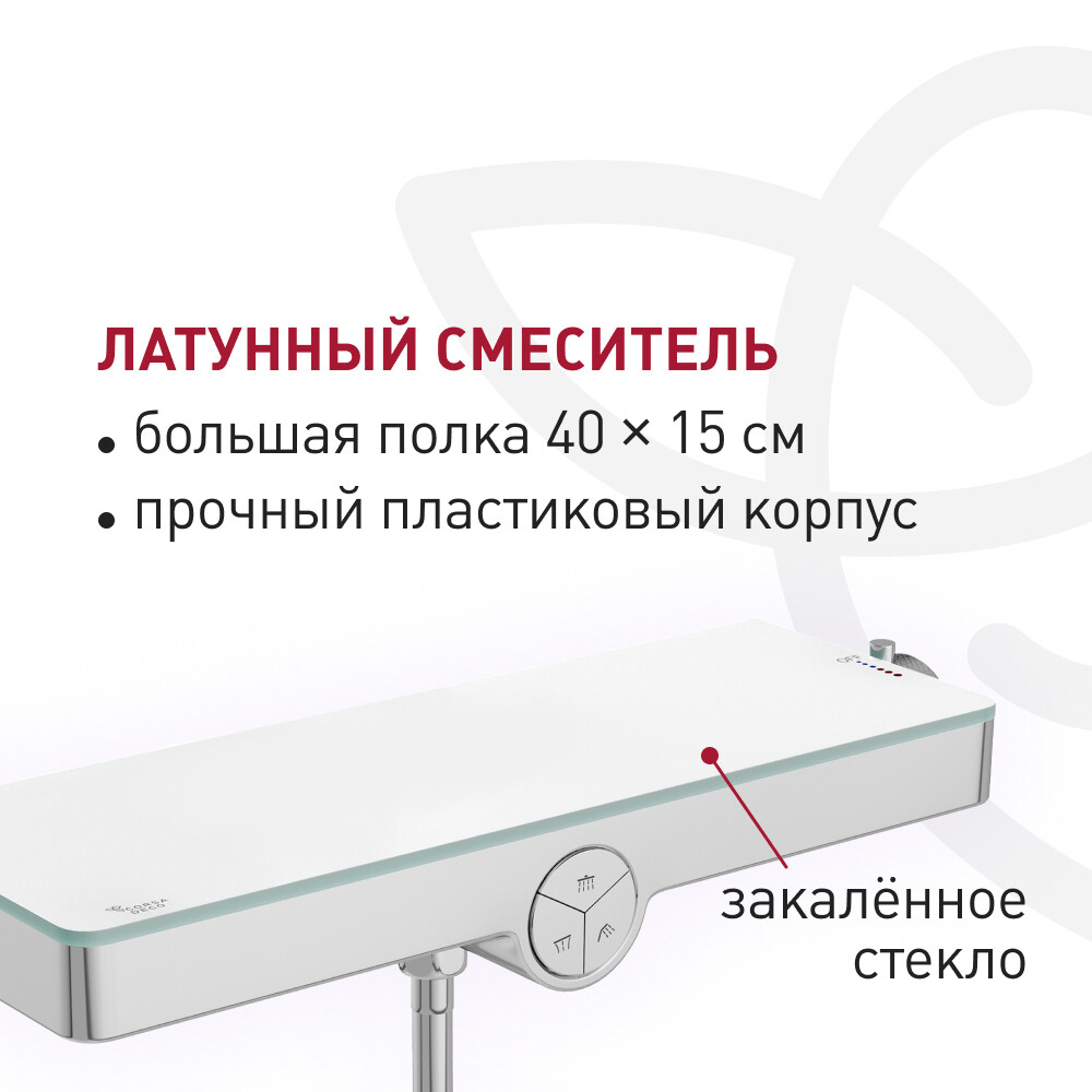 • Смеситель-полка (размер 40x18x8 cм) латунный с системой холодного пуска и скрытым водопадным изливом.