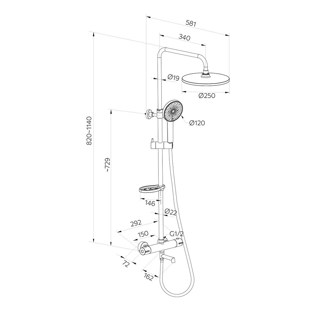 Душевая система с верхним душем и ручной лейкой с термостатом в комплекте для установки в душевой кабине или над ванной.