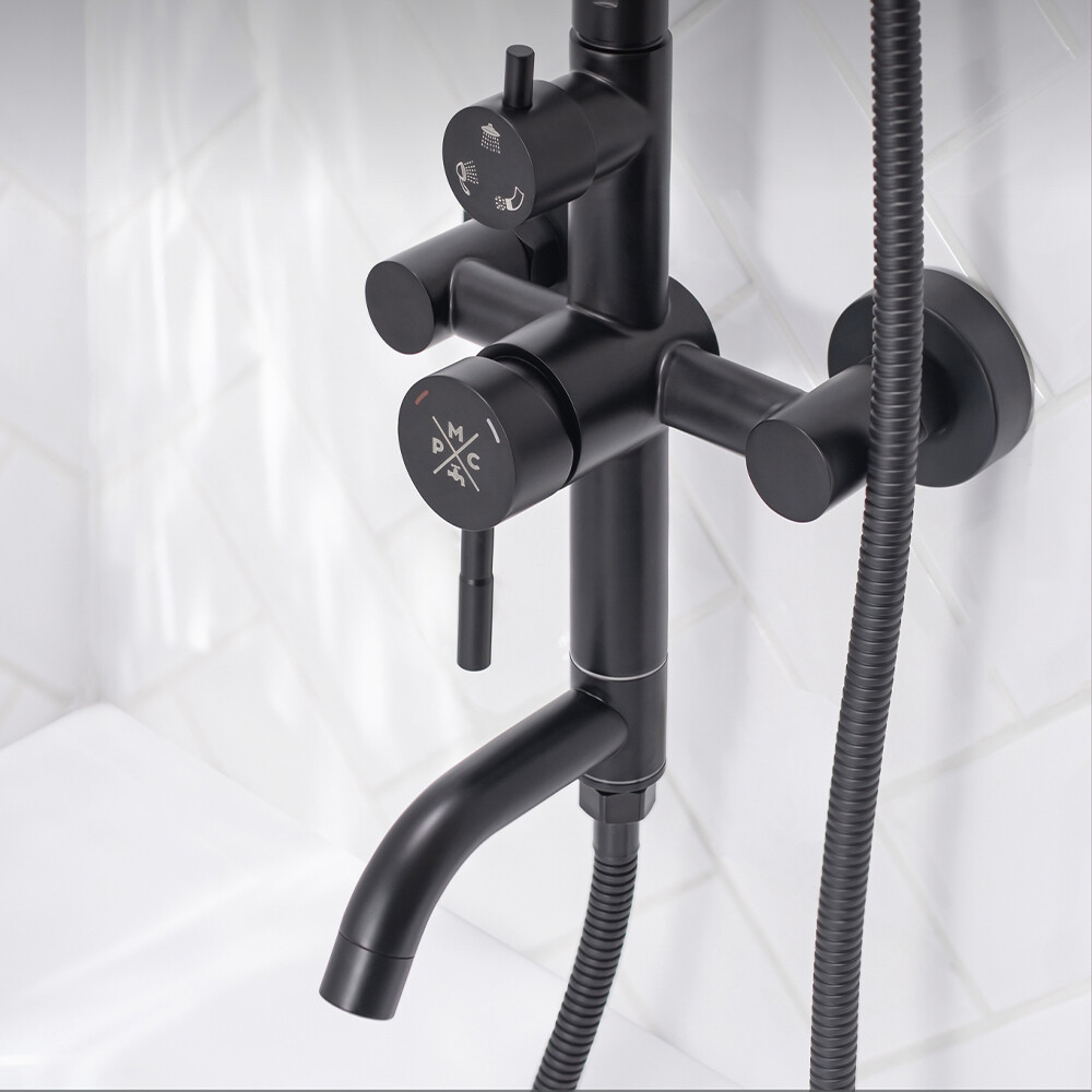 Душевая система для ванны и душевой кабины с тропическим душем и смесителем с поворотным изливом, выполнена из нержавеющей стали и покрыта специальной стойкой краской черного цвета. Керамический картридж обеспечивает плавное и точное управление потоком воды. Ручная лейка имеет 3 режима подачи воды.