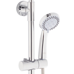 В комплектацию входит: смеситель, стойка, верхний душ, ручная лейка, шланг, держатель для лейки