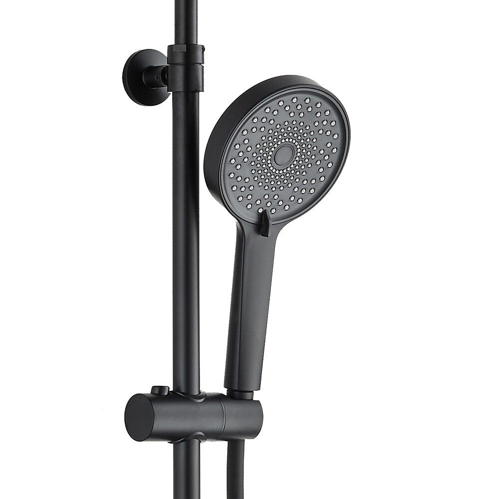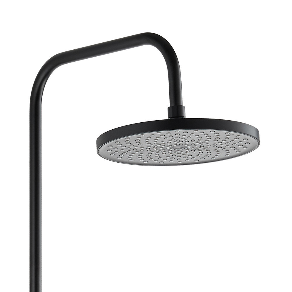 Душевой комплект с верхним душем и полкой черного матового цвета сочетает в себе современный дизайн и высокое качество.