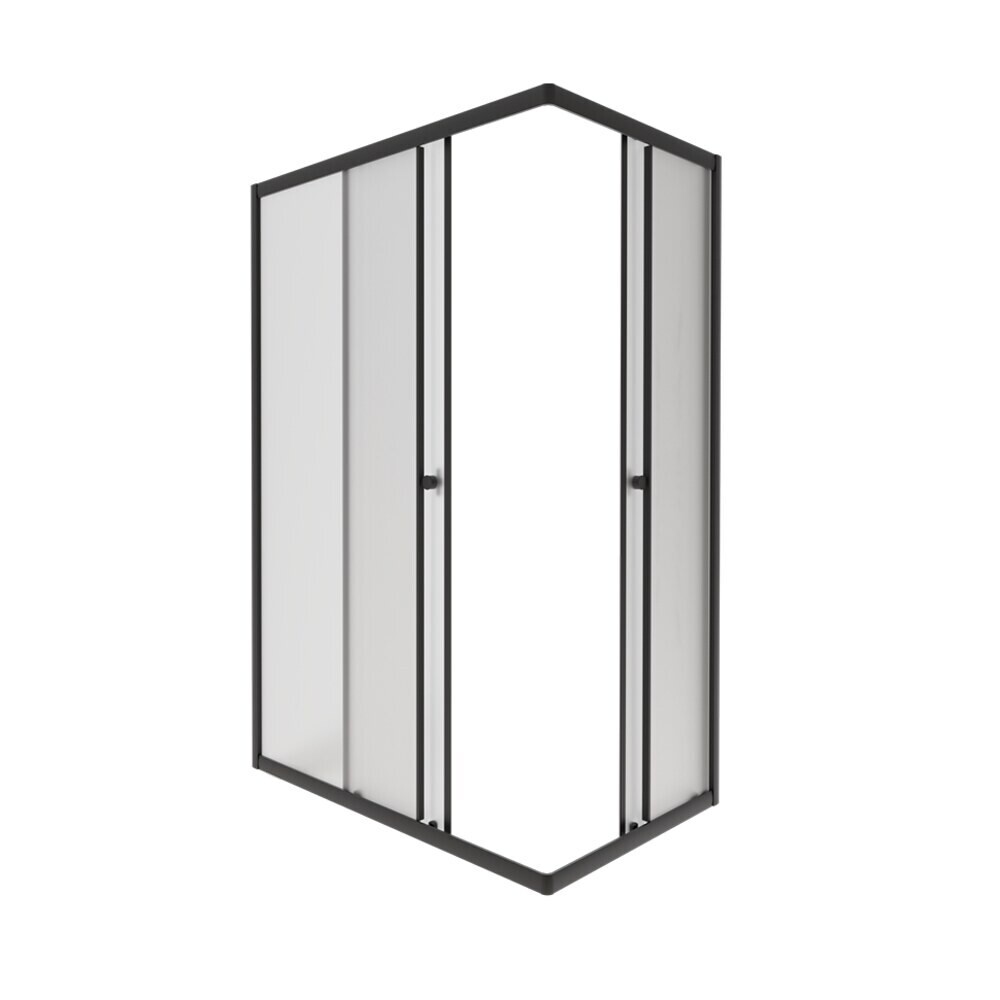 Душевое ограждение прямоугольной формы с двумя раздвижными дверцами и матовыми стеклами. Алюминиевый профиль, цвет профиля черный. Имеет возможность установки на поддон или на пол.