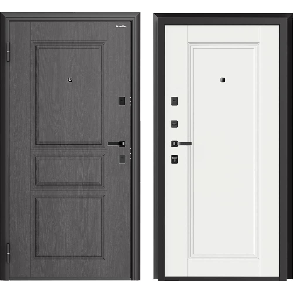 Входная дверь DoorHan Премиум предназначена для покупателей, которые ценят не только технические характеристики, но и привлекательный современный дизайн. Отличительная особенность — дверь полностью изготовлена из холоднокатаной оцинкованной стали толщиной 0,8 мм с использованием технологии бесшовного производства с 2-мя листами металла. В качестве наполнения используется огнестойкая минераловатная плита высокой плотности 130 кг/м3, заполнение полотна беспустотное. Снаружи МДФ панель в цвете Серый Графит с фрезеровкой «Классика», изнутри МДФ панель в белом цвете с фрезеровкой «Квадро».