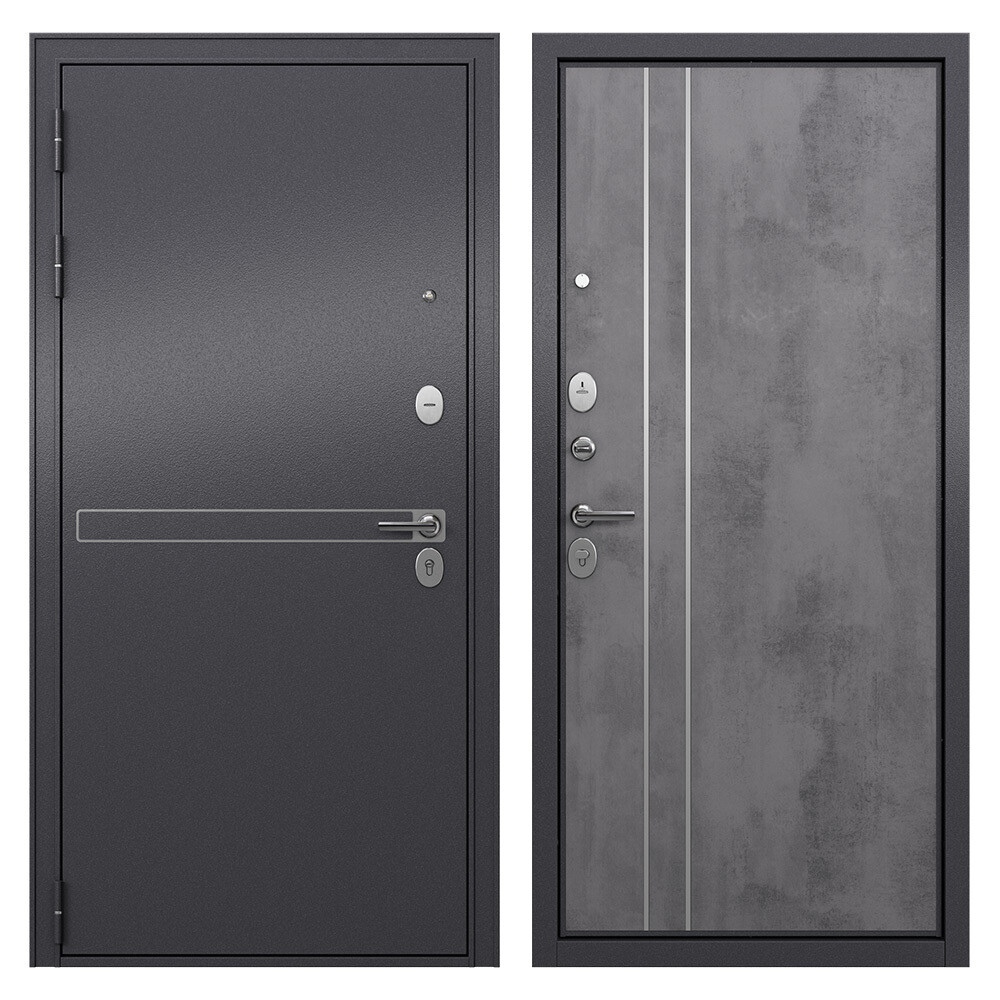 Предназначена для установки в жилых и общественных зданиях в качестве входной двери внутри помещения. Стальная дверь используется для установки в квартиру и другое помещение. Дверь обладает высокой устойчивостью к повреждению, приятный эстетичный вид. Порошково-полимерное покрытие антивандальное, имеет глянцево-матовую текстуру и современный оттенок «Букле графит». На внутренней стороне облицовано МДФ-панелью, цвет «Бетон».