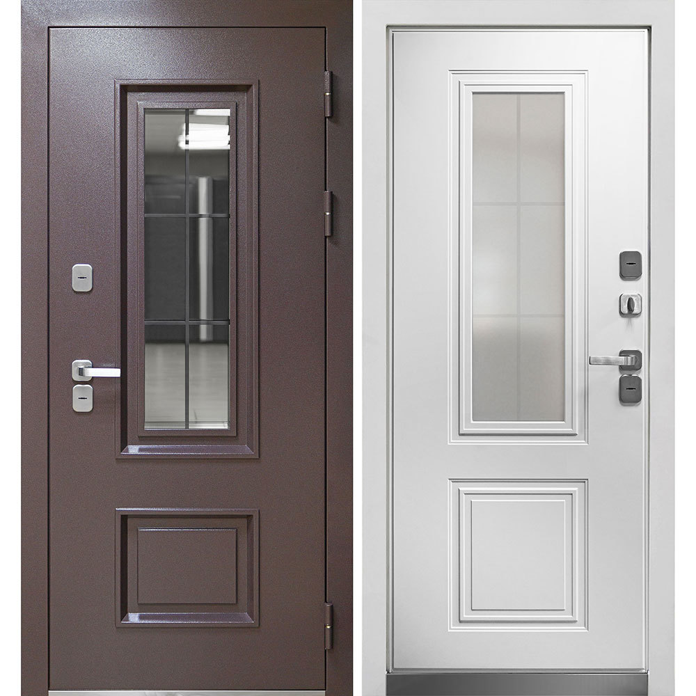 Предназначена для установки в качестве уличной входной двери в частных домах, загородных коттеджах, таунхаусах, на границе улица/дом, в том числе в жилых и общественных зданиях. Для дверей, имеющих контакт с улицей, обязательно наличие козырька, защищающего от прямых воздействий осадков и солнечного света. Полотно изготовлено из стали. С внутренней стороны облицована фрезерованной МДФ-панелью 10 мм, цвет пленки «Эмалит белый». Стеклопакет — 3 камеры, 95 мм, тонированный, ковка внутри.