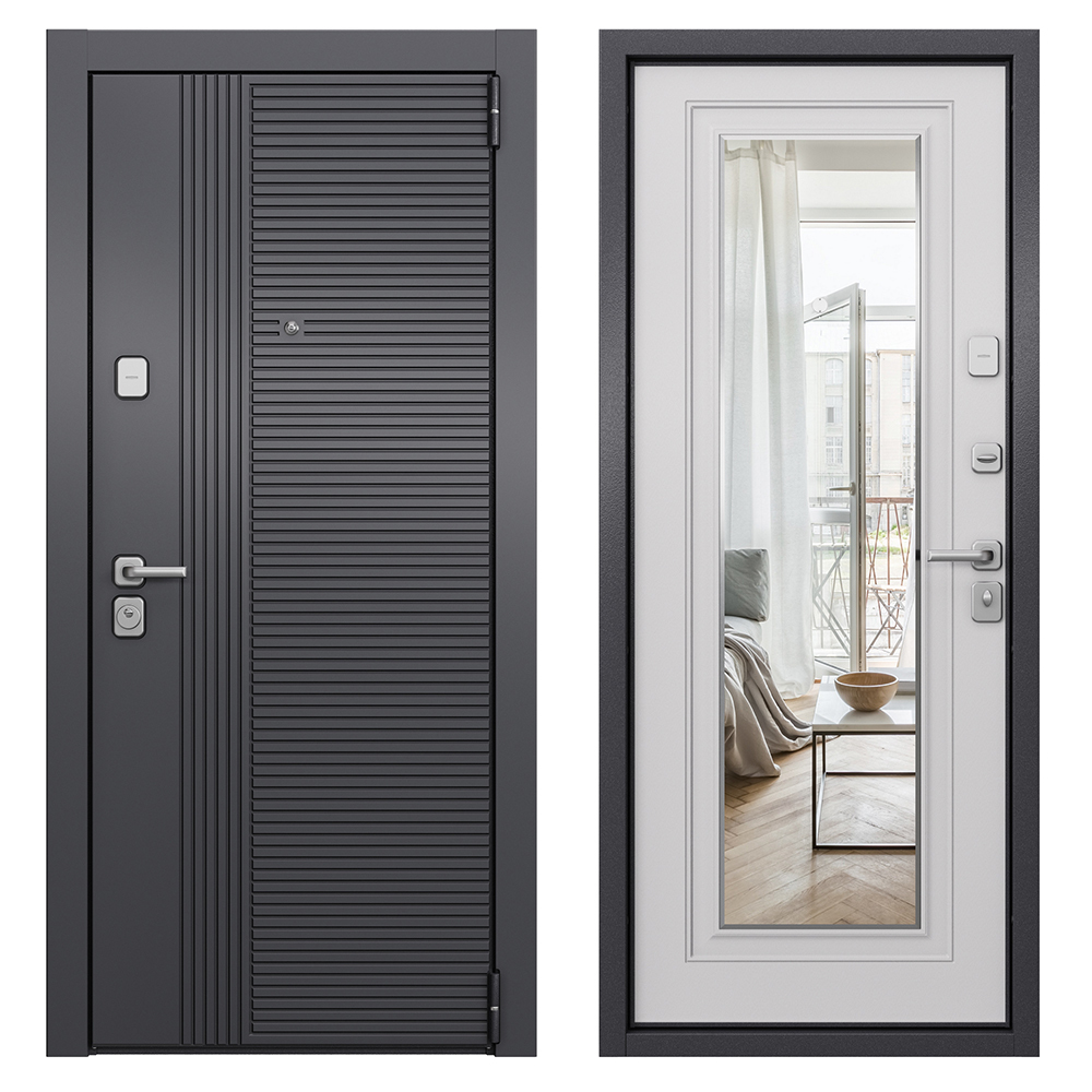 Наполнение — минеральная плита высокой плотности + пенополистирол. Предназначена для установки в жилых и общественных зданиях в качестве входной двери внутри помещения. Полотно изготовлено из стали. Стальной лист 1,4 мм с атмосферостойким порошковым покрытием цвета «Темно-серый букле графит»; с внешней отделкой МДФ в цвете «Оскуро» с декоративной отделкой; с внутренней стороны МДФ в цвете «Бьянко» + зеркало.