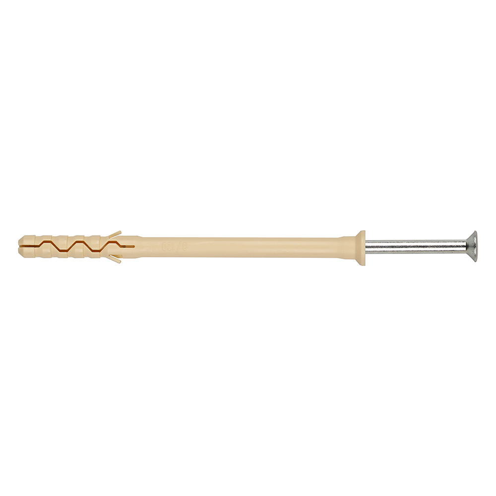 Нейлон обеспечивает надежное сцепление с материалом основания. Резьбовой оцинкованный гвоздь повышенной прочности заранее установлен в дюбель.