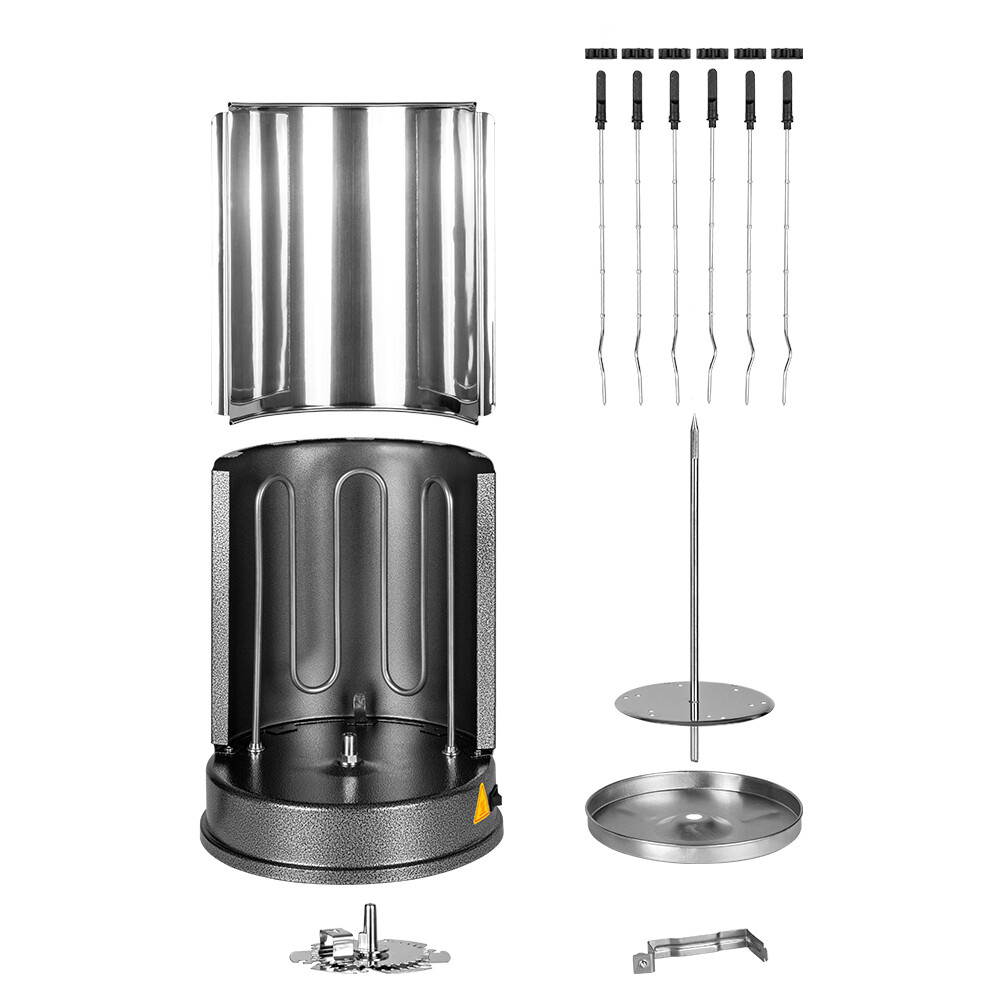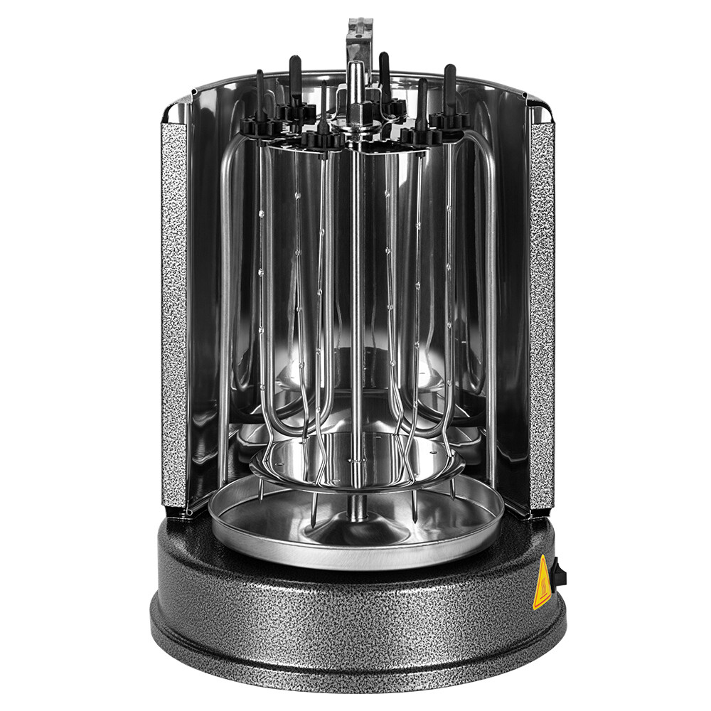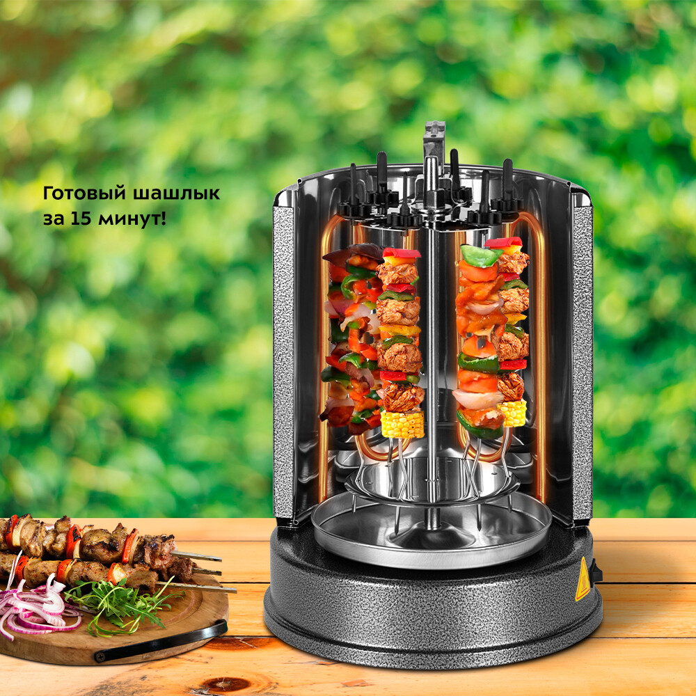 Электрошашлычница Kitfort КТ-1404 позволит вам приготовить сочный шашлык в любое время года, достаточно лишь подключить устройство к электросети. Инфракрасный нагревательный элемент обеспечивает такой же нагрев, какой дают угли в обычном мангале, а автоматическое вращение шампуров позволяет мясу оставаться сочным внутри и равномерно обжаренным снаружи. Помимо шашлыка из мяса, рыбы или овощей, можно готовить шаверму, люля-кебаб, сардельки, кукурузу-гриль, картошку или гренки. За 1 раз вы можете приготовить до 4 кг еды. Под шампурами расположена специальная тарелочка для сбора сока и жира. Боковые шампуры оснащены удобными ручками из ненагревающегося материала, поэтому их можно брать руками, не боясь обжечься. В задней части шашлычницы помещен отражательный экран, он съемный и свободно вынимается вверх для чистки.