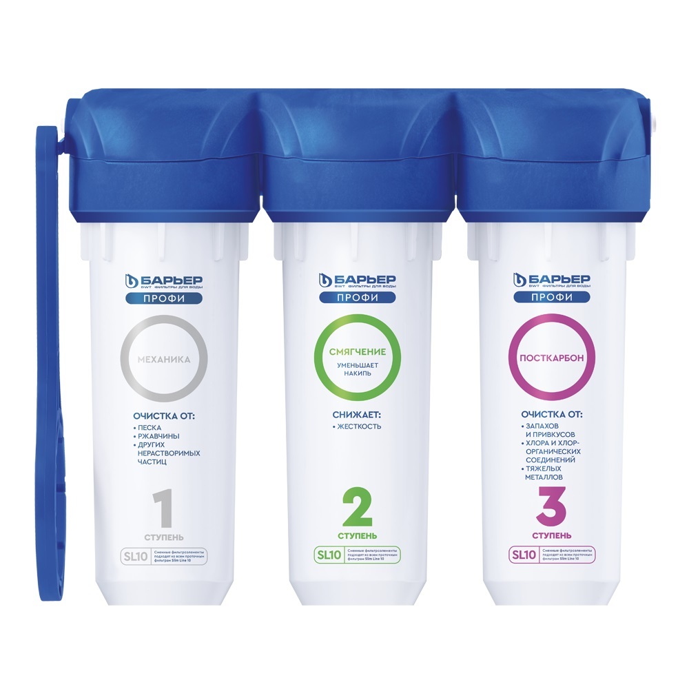 Фильтр для очистки воды Барьер Профи Hard Н122Р00 — набор из трех фильтрационных элементов, который включает в себя фильтр механических примесей размером до 5 мкм (например, песок или окалина), фильтр для снижения жесткости воды (из-за которой может образовываться накипь в посуде) и фильтр, служащий для удаления неприятных запахов воды и хлора. Ресурса фильтрационной системы хватает на объем воды до 10 000 л при производительности 2 л/мин. Фильтр легко устанавливается и снимается для замены картриджей.