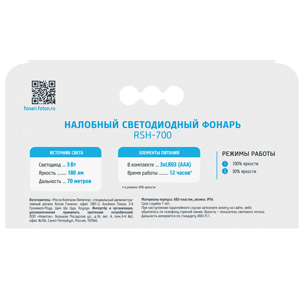 Фонарь налобный Фотон RSH-700 светодиодный 1 LED 3 Вт на батарейках ААА пластик 2 режима (23129)