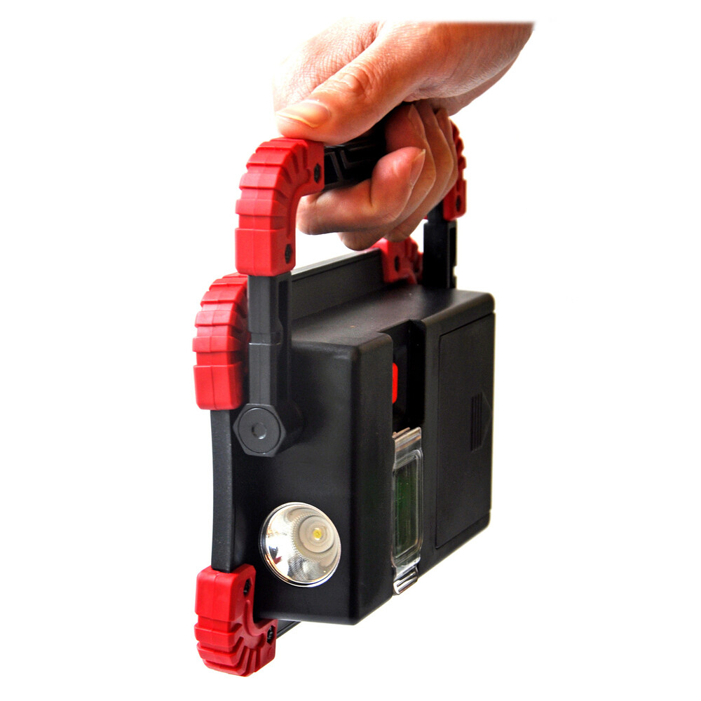 Предназначен для уличного освещения. Аккумуляторный прожекторный фонарь с двумя источниками света на линзованных COB-диодах общей мощностью 10 Вт и дополнительным боковым светильником. Срок службы светодиодов составляет 100 000 часов. Прожектор работает в трех режимах: яркий, приглушенный и вспышка. Корпус выполнен из прочного пластика, оборудован эргономичной регулируемой ручкой для переноски и установки в нужном месте. Аккумулятор обеспечивает непрерывную работу на протяжении до четырех часов. Прожектор можно заряжать через USB-порт или от трех батареек типа АА (в комплект не входят), а также использоваться в качестве внешнего аккумулятора для подзарядки мобильных устройств. Повышенная защита от влаги и пыли позволяет применять фонарь в самых экстремальных условиях.