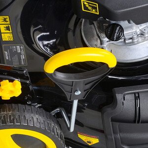 Косилка обладает самоходной конструкцией, оператору не нужно толкать аппарат, только указывать направление движения. Ширина среза – 530 мм, высота регулируется от 25 до 75 мм.