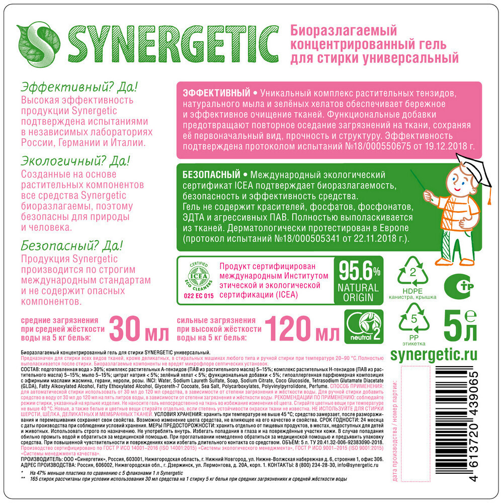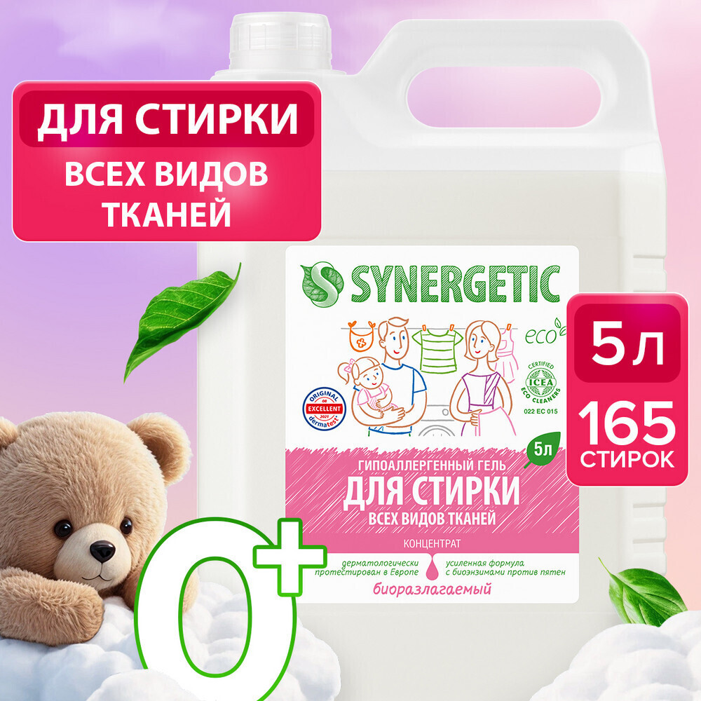 Биоразлагаемый концентрированный гель для стирки Synergetic универсальный обеспечивает бережное и эффективное очищение тканей, гигиеническую чистоту одежды и устраняет неприятные запахи. Комбинация энзимов и растительных ПАВ эффективно удаляет загрязнения и свежие пятна с волокон ткани даже в холодной воде. Функциональные добавки предотвращают окрашивание, а также повторное оседание загрязнений на ткани, сохраняя ее первоначальный вид, насыщенность цвета, прочность и структуру. Гипоаллергенная отдушка на основе эфирных масел оставляет легкий и приятный аромат. Гель предназначен для стирки всех видов тканей, кроме деликатных и мембранных, а также шерсти и шелка. Средство можно использовать в стиральных машинах любого типа и при ручной стирке при температуре 15-90°C. Биоразлагаемый гель полностью выполаскивается из тканей, подходит для стирки детского белья 0+ и одежды людей с чувствительной кожей.