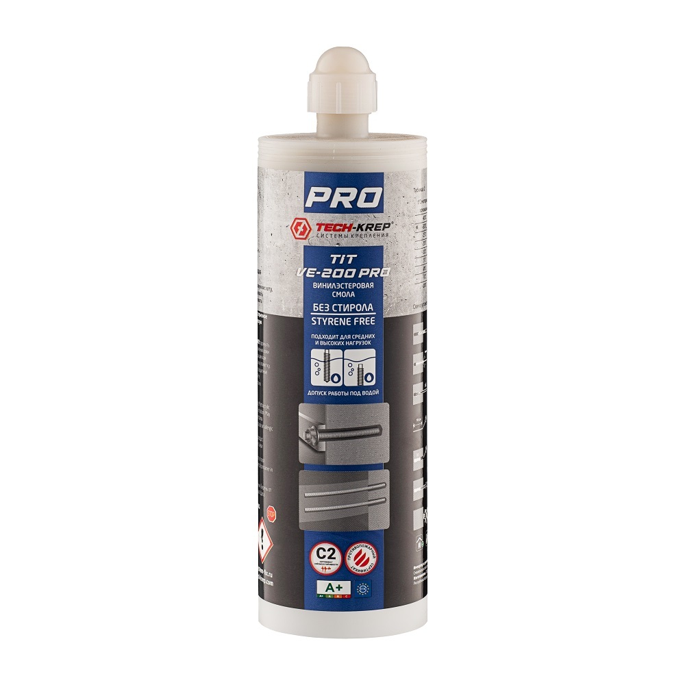На основе винилэстеровой смолы. Без стирола — без запаха (можно использовать в закрытых помещениях). Для высоких нагрузок (5 тонн при использовании шпильки М10 класса прочности 8.8, установленной в бетон В25 на 100 мм). Быстро схватывается (возможность быстрее закрепить деталь). Применяется для крепления арматуры и резьбовых шпилек, тяжелых ответственных конструкций, металлоконструкций.