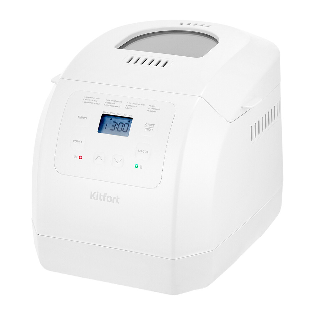 Хлебопечь КТ-312 позволяет готовить различные виды хлеба, джем и кексы, а также тесто. Корпус прибора сделан из пластика.