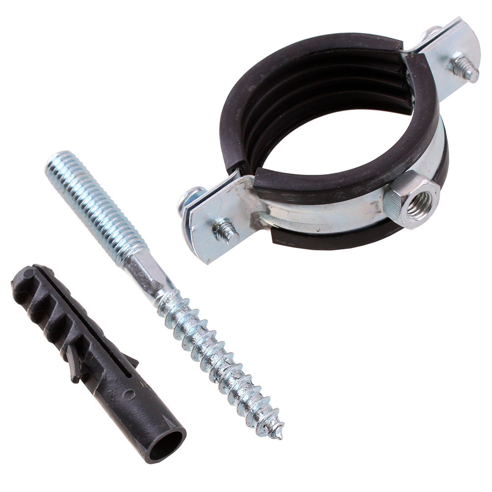 Состав: хомут, шпилька М8 – оцинкованная сталь, уплотнитель – резина, дюбель 10х50 – полипропилен.