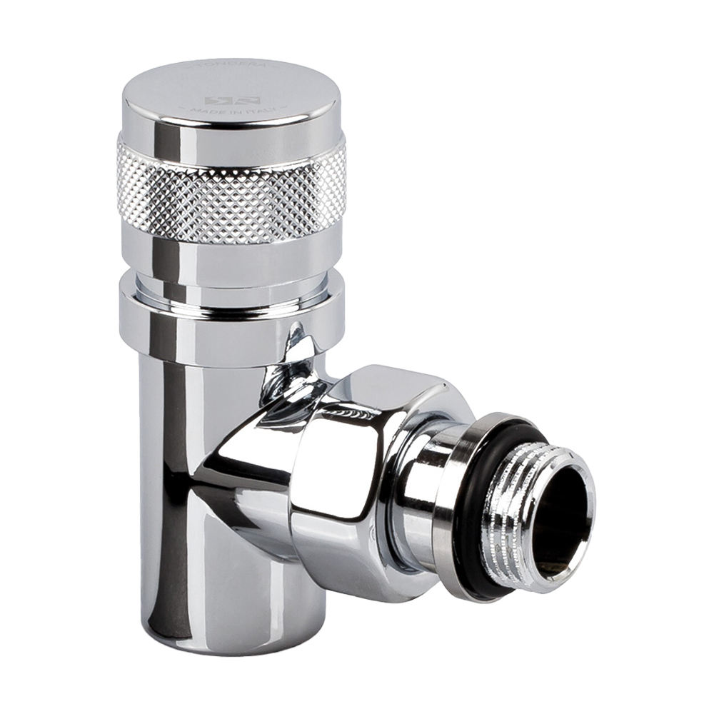 Вентиль на подачу SR Rubinetterie серия Tondera угловой, ручной регулировки, преобразуемый в термостатический, с механизмом предварительной настройки, соединение для железной трубы, хвостовик с герметичной прокладкой.