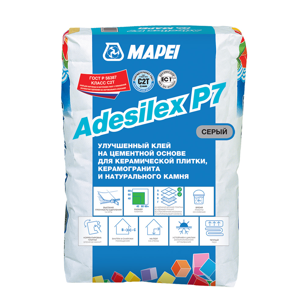 Главная / Каталог / Стройматериалы / Сухие строительные смеси / Клей для плитки / Клей для плитки/ керамогранита/ камня Mapei Adesilex P7 высокопрочный серый класс C2 T 25 кг