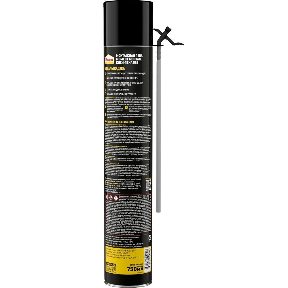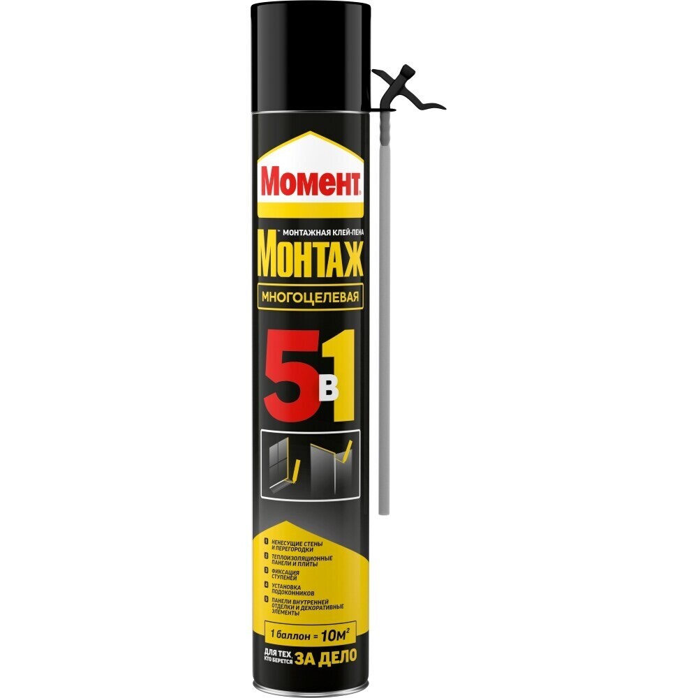 5-в-1 Момент Монтаж с трубочкой-аппликатором – это готовая к употреблению, твердеющая под воздействием влаги, сверхэффективная, универсальная полиуретановая расширяющаяся клей-пена. Превосходная адгезия в сочетании с небольшой заполняющей способностью делает клей-пену особенно подходящей для неровных поверхностей.