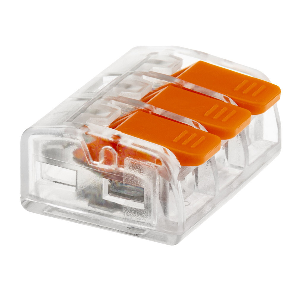 Cоединительные монтажные клеммы Duwi СМК 223-413 являются полным аналогом клемм Wago/Ваго. Прозрачные 3-х контактные клеммы подходят для соединения моножильных и многожильных проводов, защищая их от повреждения и исключая возможность замыкания. Моножильные провода достаточно только зачистить, а многожильные — нужно обжать наконечником для наилучшего соединения контактов. Рычажки предназначены для надежного зажима кабелей. Клеммы используются в целях переменного и постоянного тока с напряжением до 400В. Номинальный ток: 32 А. Прозрачный корпус позволяет отследить качество соединения. Клеммы обладают следующими преимуществами: простое и быстрое подключение, монтаж без инструментов, многократное использование, улучшенная токовая проводимость зажимов, подходят для жесткого и гибкого кабеля, а также для многожильных кабелей. Сечение жесткого проводника 4 мм2. Клеммы Duwi выполнены из негорючих материалов — термостойкий пластик, а специальные пазы в корпусе исключают возможность случайного отсоединения проводников. Рабочая температура составляет от -25С до +85С. Набор клемм из 5 штук упакован в пакет с многоразовым замком, который легко открыть и закрыть. Это позволит сохранить порядок при ремонтных работах и при хранении клемм.