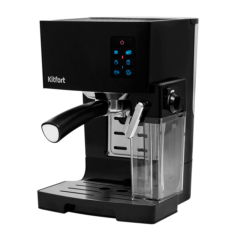 Рожковая кофеварка Kitfort КТ-743 приготовит ароматный кофе эспрессо, капучино или латте, а также множество других видов кофе. Одна порция готовится 25-30 секунд. Данная модель имеет встроенный капучинатор. Нужно только залить в него пастеризованное молоко 2,5-3,5% жирности, включить его, выбрать нужный напиток и установить интенсивность подачи молока/молочной пенки. Кнопками на панели управления выбирается тип напитка: эспрессо, капучино или латте, желаемый объем напитка, а также включается и выключается капучинатор. Кнопка режима самоочистки служит для включения очистки капучинатора. Хотя платформа и не имеет своего подогревателя, а нагревается от тепла, выделяемого при работе кофеварки, на нее можно ставить чашки, чтобы они были теплыми или лучше сохли после мытья. Откидная площадка на корпусе кофеварки специально предусмотрена для того, чтобы каждая капля любимого эспрессо попадала даже в маленькую кружку. Резервуар для воды объемом 1,4 л легко снимается и наполняется водой. Если вода в резервуаре закончится, об этом сообщит специальный индикатор отсутствия воды. Поддон для сбора капель со съемной решеткой из нержавеющей стали легко снимается, моется и устанавливается обратно. В комплекте к кофеварке идет ложка-темпер. Темпер используется для утрамбовки молотого кофе и как мерная ложка. Металлический фильтр у рожка идет с лазерным нанесением отверстий. Он долговечен и не требует использования каких-либо расходующихся частей.