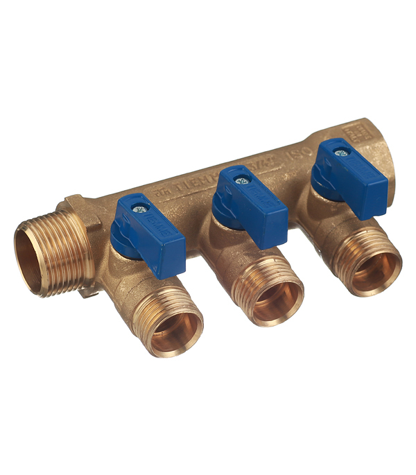 Предназначен для равномерного распределения и поступления воды от главного трубопровода по металлопластиковым трубам к сантехнике и другим потребителям без потери напора воды. Позволяет изолировать часть системы в случае неисправностей и проводить ремонт, не производя при этом общего отключения водоснабжения. Используется для разделения потока воды из одной трубы на три линии. Имеет с одного входа внутреннюю резьбу 3/4″ (20 мм) с другого входа наружную резьбу 3/4″ (20 мм), что позволяет соединять коллекторы между собой, увеличивая количество отводимых линий. Ручки синего цвета. Межосевое расстояние между отводами 36 мм.