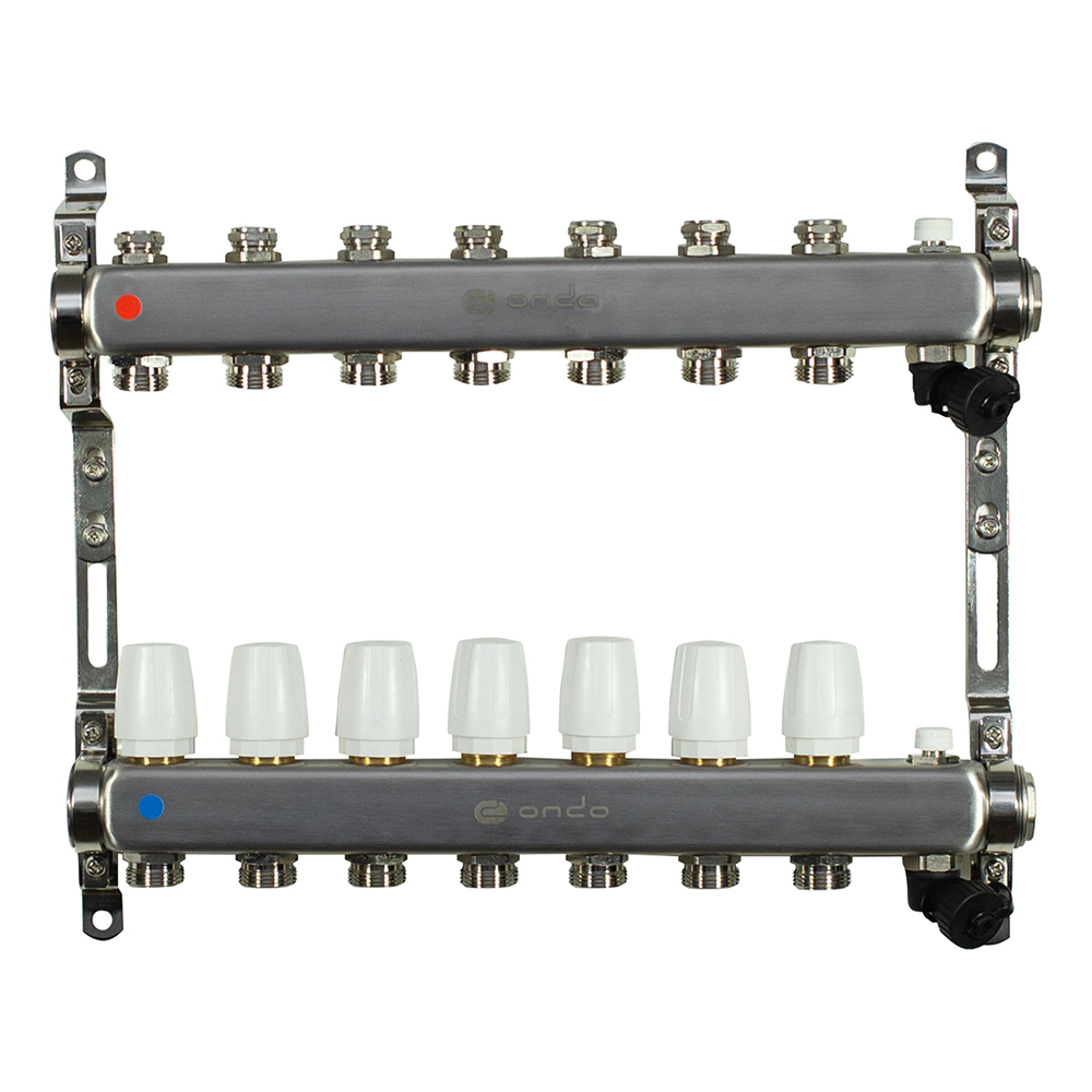 Коллекторная группа ONDO из нержавеющей стали предназначена для оптимизации, контроля и распределения теплоносителя в системах радиаторного и напольного отопления. Коллекторная группа — важный элемент водяного теплого пола. Благодаря ей происходит смешивание горячей и холодной жидкости. Такая особенность позволяет произвести регулировку температуры теплого пола и контролировать его работу. Коллекторная группа ONDO может работать на водяном, либо этиленгликолевом теплоносителе с максимальным содержанием гликоля не более 45%. Коллекторная группа поставляется предварительно в собранном виде. Воздухоотводчик и дренажный кран встроены в корпус. Материал корпуса — нержавеющая сталь. Установочные кронштейны входят в комплект. Насосно-смесительный узел приобретается отдельно. Данная модификация построена на использовании термостатических и запорных клапанов. Детали коллекторной группы соединены между собой на заводе с помощью уплотнительных колец и герметизированы специальным анаэробным клеем. Это позволяет отказаться от дополнительных герметизирующих и уплотнительных материалов при установке. Изделие соответствует требованиям ГОСТ 12.2.063–2015.