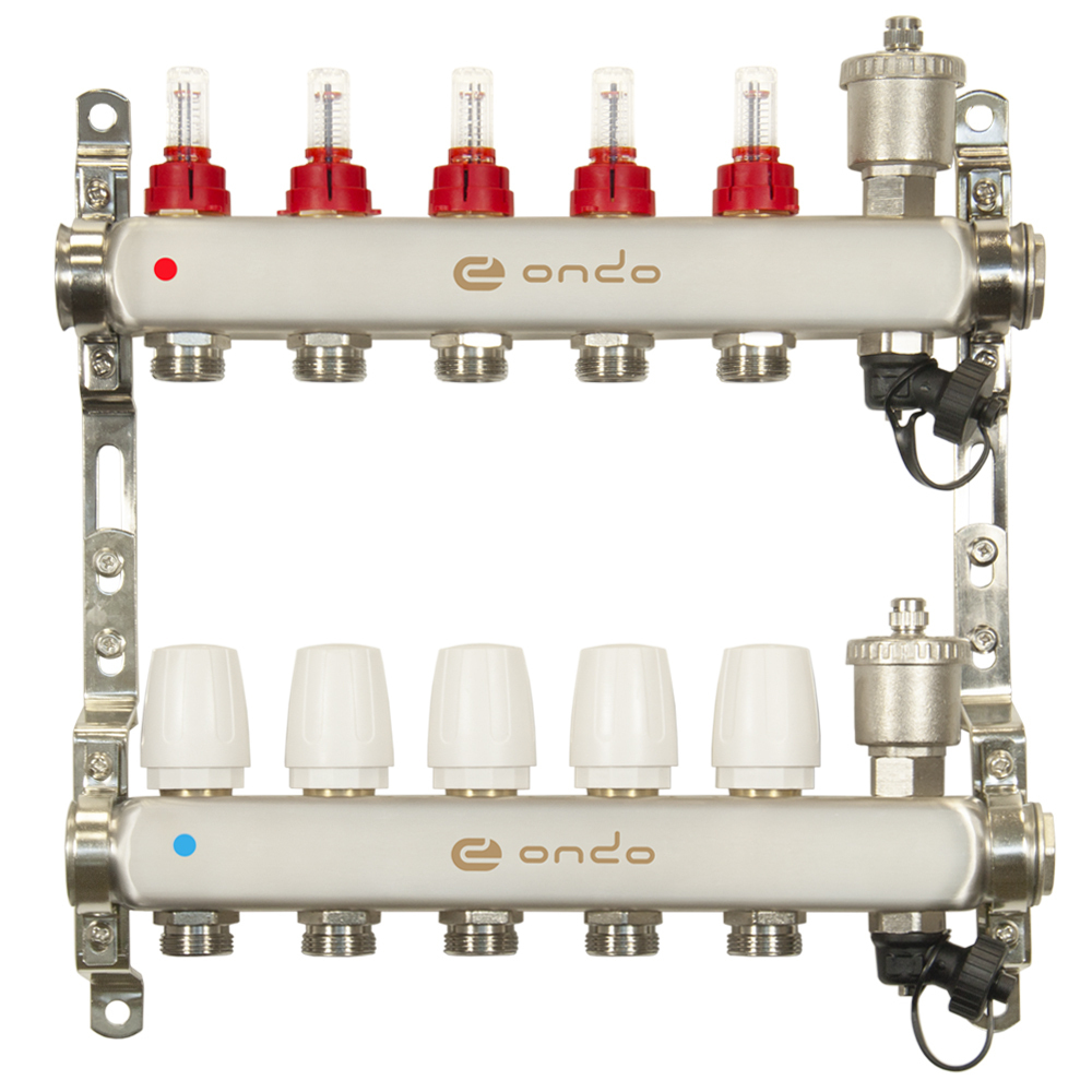 Коллекторная группа ONDO из нержавеющей стали предназначена для оптимизации, контроля и распределения теплоносителя в системах радиаторного и напольного отопления. Коллекторная группа — важный элемент водяного теплого пола. Благодаря ей происходит смешивание горячей и холодной жидкости. Такая особенность позволяет произвести регулировку температуры теплого пола и контролировать его работу. Коллекторная группа ONDO может работать на водяном, либо этиленгликолевом теплоносителе с максимальным содержанием гликоля не более 45%. Коллекторная группа поставляется предварительно в собранном виде. Автоматический воздухоотводчик и дренажный кран встроены в корпус. Материал корпуса — нержавеющая сталь. Установочные кронштейны входят в комплект. Насосно-смесительный узел приобретается отдельно. Данная модификация построена на использовании расходомеров и термостатических клапанов. Детали коллекторной группы соединены между собой на заводе с помощью уплотнительных колец и герметизированы специальным анаэробным клеем. Это позволяет отказаться от дополнительных герметизирующих и уплотнительных материалов при установке. Изделие соответствует требованиям ГОСТ 12.2.063–2015.