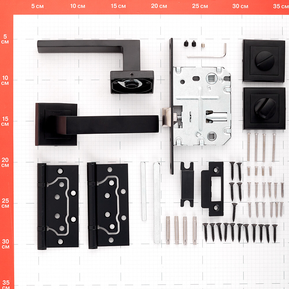 Комплектация: ручка на розетке — 2 шт, петля накладная универсальная 100х75х2,5 мм — 2 шт, стяжка (стягивающая втулка) — 2 шт, замок межкомнатный под фиксатор — 1 шт, накладка-фиксатор — 2 шт, стержень квадратный соединительный 8х8 мм — 1 шт, стержень квадратный соединительный 6х6 мм — 1 шт, шестигранный ключ — 2 шт, комплект крепежа, инструкция.