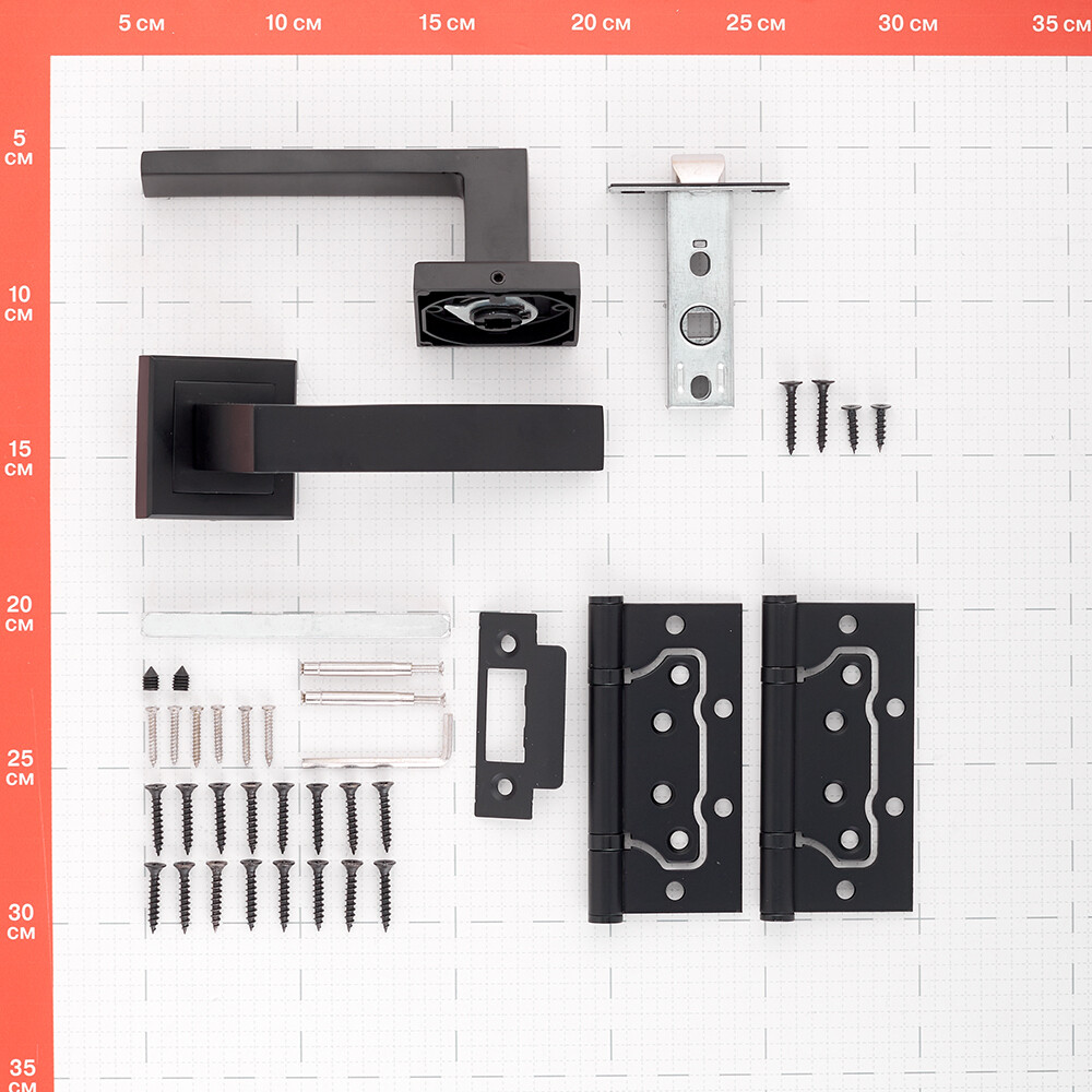 Комплектация: ручка на розетке — 2 шт, петля накладная универсальная 100х75х2,5 мм — 2 шт, стяжка (стягивающая втулка) — 2 шт, защелка межкомнатная — 1 шт, стержень квадратный соединительный 8х8 мм — 1 шт, шестигранный ключ — 2 шт, комплект крепежа, инструкция.