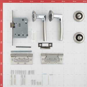 ручка на розетке – 2 шт, петля накладная универсальная 100х75х2,5 мм – 2 шт, стяжка (стягивающая втулка) – 2 шт, замок межкомнатный под фиксатор – 1 шт, накладка-фиксатор – 2 шт, стержень квадратный соединительный 8х8х105 мм – 1 шт, стержень квадратный соединительный 6х6 мм – 1 шт, шестигранный ключ – 2 шт, комплект крепежа, ответная планка, инструкция.
