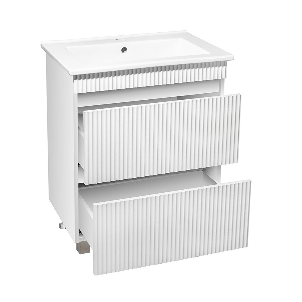 Тумба с раковиной Runo Модена 660 мм напольная белая (00-00001452) – это изысканность и утонченная роскошь в интерьере. Волнистые рифленые фасады визуально «оживляют» и «приводят в движение» всю обстановку комнаты, сохраняя при этом умиротворение и покой, превосходно сочетаются с классическим белым цветом корпуса. Цвет фасада также классический – белый глянец, идеально впишется в любой интерьер ванной комнаты. Тумба для ванной оснащена двумя выдвижными ящиками на шариковых направляющих.