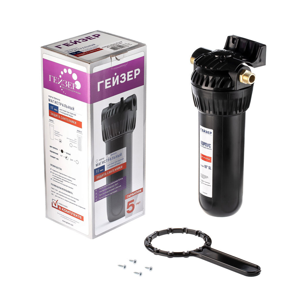 Корпус Гейзер 10SL 1/2″ изготовлен из термостойкого полиамида с металлическими ниппелями. Корпус рассчитан на работу под давлением и установку на входе в систему горячего или холодного водоснабжения. Комплектуется пластиковой скобой. В производстве корпусов используются материалы пищевого класса.