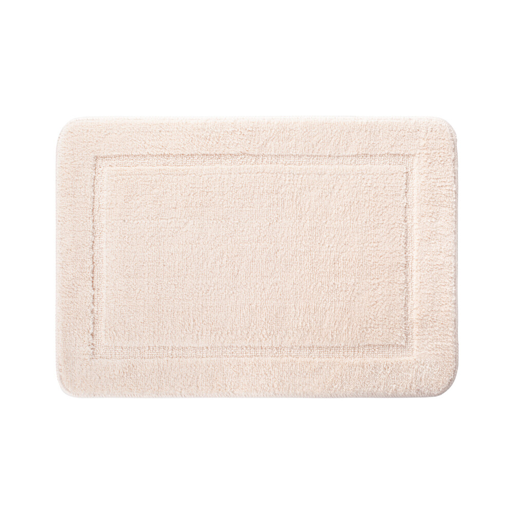 Мягкий коврик для ванной бежевого цвета с плотным, невысоким ворсом (1 см), приятный на ощупь. Ворс из микрофибры отлично держит форму, легко чистится и быстро сохнет.