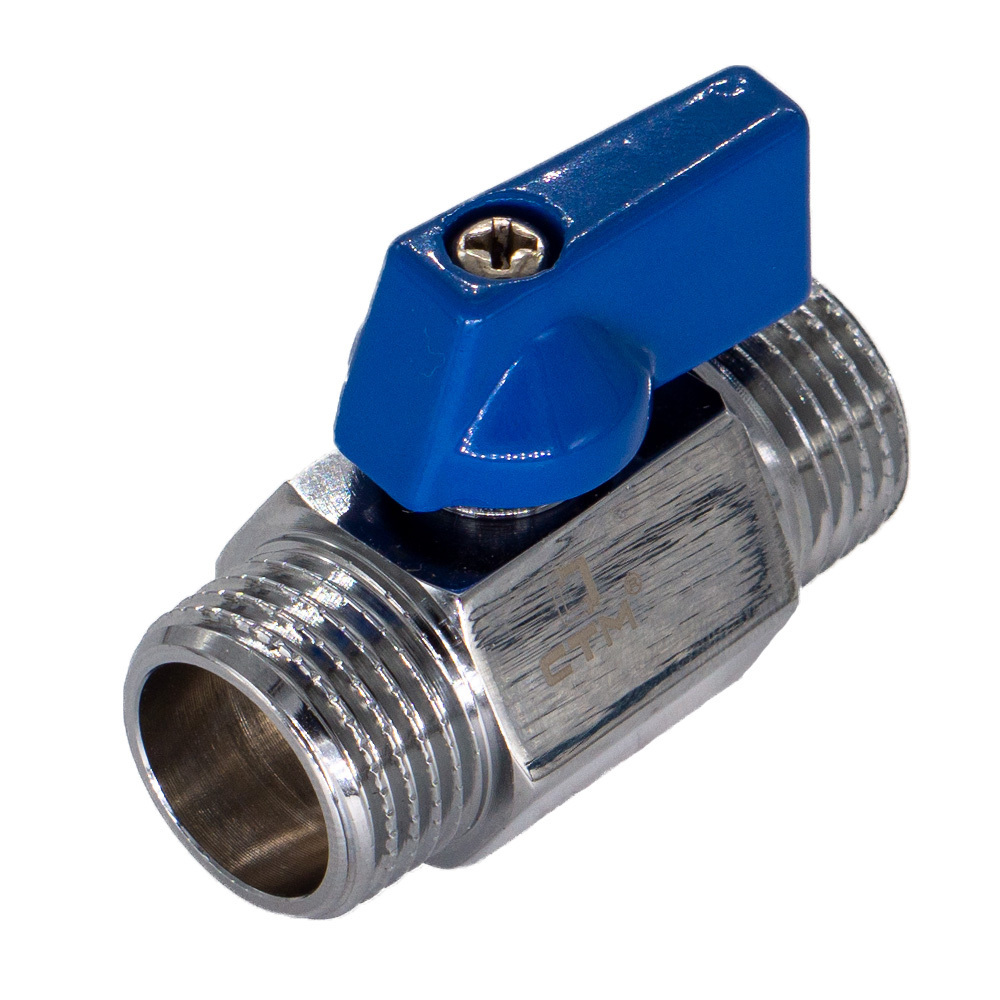 Кран шаровой мини для воды 1/2″ CTM хромированный с наружной резьбой применяется в качестве запорной арматуры на трубопроводах систем питьевого, хозяйственно-бытового назначения, систем холодного и горячего водоснабжения к бытовым и сантехническим приборам. Корпус крана изготовлен из высококачественной горячепрессованной латуни с хромированным покрытием толщина гальванопокрытия 0,2 мкм. Шаровой затвор изготовлен из высококачественной горячепрессованной латуни отполирован и покрыт хромом. Герметичность затвора крана соответствует наиболее высоком классу по ГОСТу 9544-2005 – А. Кран оснащен алюминиевой ручкой флажкового типа окрашенной в синий цвет, ручка красного цвета идёт в комплекте. Техническое обслуживание крана в течение всего срока эксплуатации не требуется.