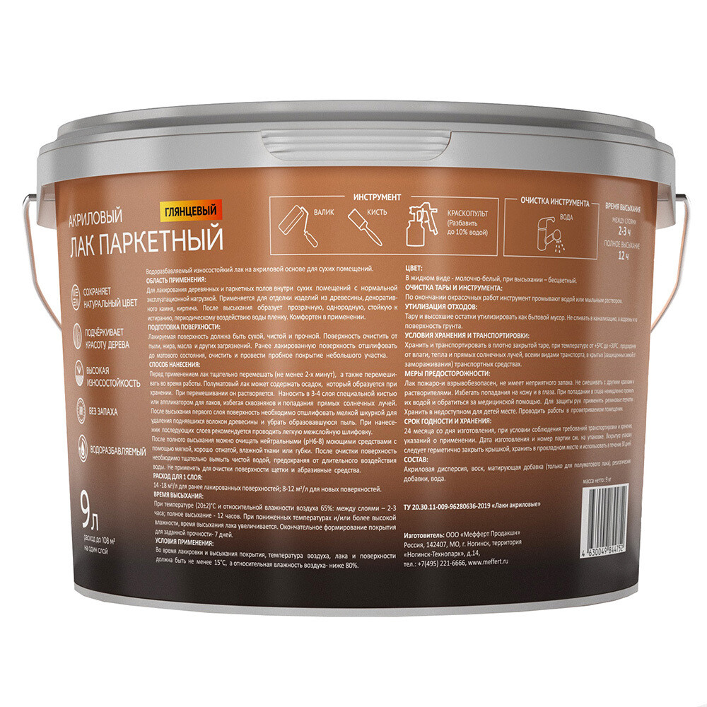 Акриловый паркетный лак предназначен для лакирования деревянных и паркетных полов внутри сухих помещений с нормальной эксплуатационной нагрузкой. Применяется для отделки изделий из древесины, декоративного камня, кирпича. После высыхания образует прозрачную, однородную, стойкую к истиранию, периодическому воздействию воды пленку. Комфортен в применении.