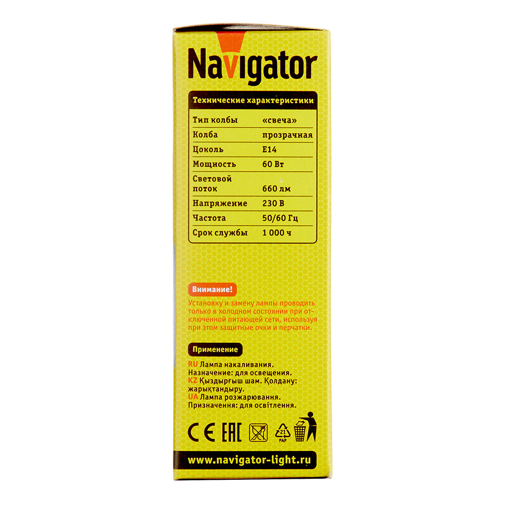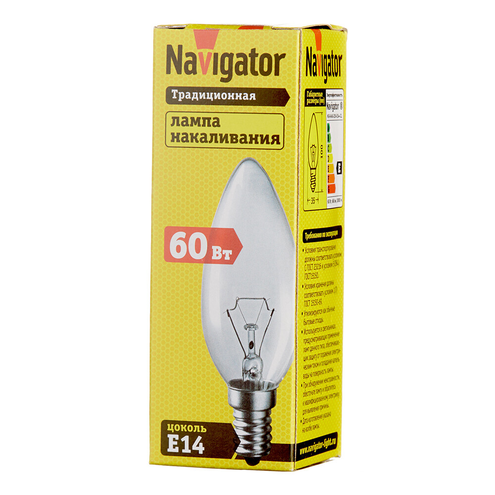 Лампа накаливания Navigator E14 60 Вт 660 Лм 230 В свеча прозрачная