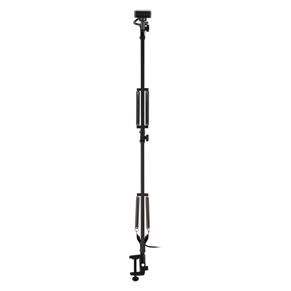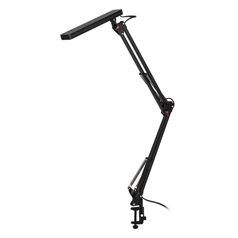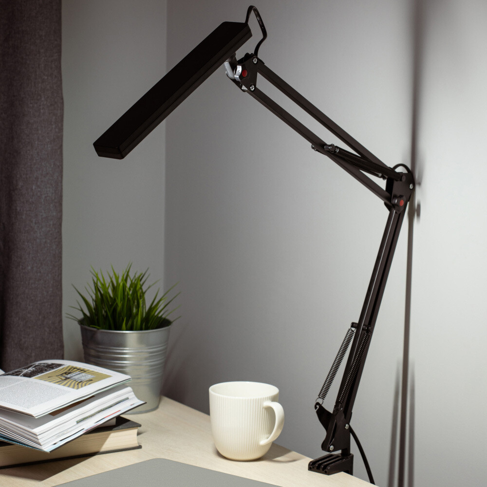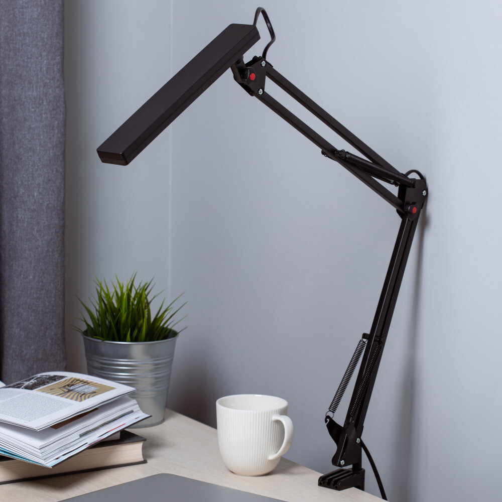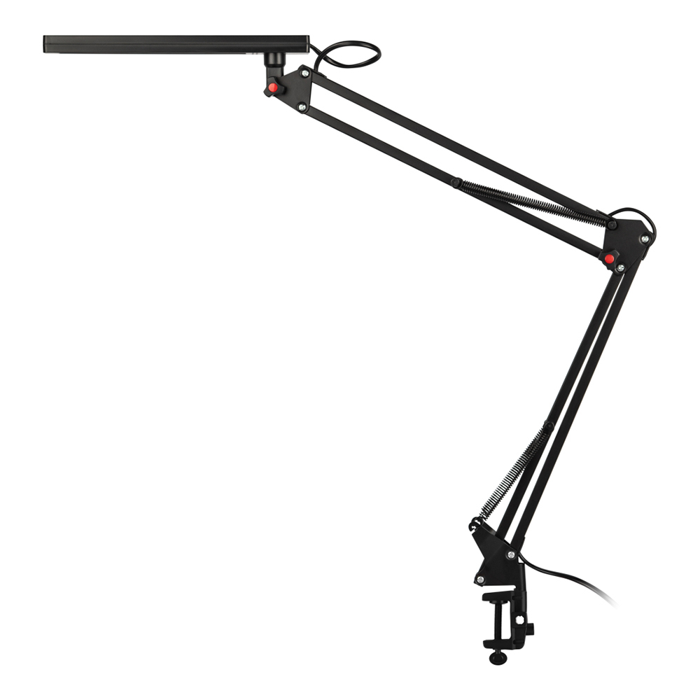 Светильник со светодиодами (LED) в качестве источников света. Модель на струбцине. Выключатель на проводе. Изменяемая цветовая температура — 3000К/4500К/6000К. Высота плафона регулируется двухсекционной сгибающейся стойкой, направление света регулируется поворотом плафона в любом направлении.