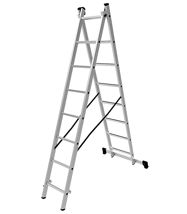 Лестница многофункциональная алюминиевая 2-х секционная, в каждой секции 8 ступеней. Имеет широкие алюминиевые скобы, обеспечивающие плотный зажим выносной секции и прочные страховочные стяжки, предохраняющие лестницу от самопроизвольного раскладывания.
